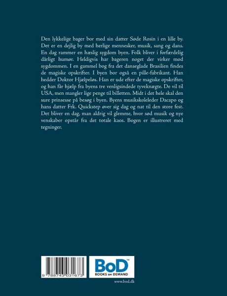 Den lykkelige bager bor med sin datter Søde Rosin i en lille by. Det er en dejlig by med herlige mennesker, musik, sang og dans. En dag rammer en hæslig sygdom byen. Folk bliver i forfærdelig dårligt humør. Heldigvis har bageren noget der virker mod sygdommen. I en gammel bog fra det danseglade Brasilien findes de magiske opskrifter. I byen bor også en pille-fabrikant. Han hedder Doktor Hjælpeløs. Han er ude efter de magiske opskrifter, og han får hjælp fra byens tre venligsindede tyveknægte. De vil til USA, men mangler lige penge til billetten. Midt i det hele skal den sure prinsesse på besøg i byen. Byens musikskoleleder Dacapo og hans datter Frk. Quickstep øver sig dag og nat til den store fest. Det bliver en dag, man aldrig vil glemme, hvor sød musik og nye venskaber opstår fra det totale kaos. Bogen er illustreret med tegninger.