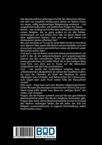 Die abenteuerliche Lebensgeschichte des Menschen Moses, mit dem vor ungefähr dreitausend Jahren im Nahen Osten ein neuer, völlig andersartiger Religionstyp entstand - mit ungeahnten kulturellen wie politischen Folgen bis heute.Moses - wer verbirgt sich hinter dem mythischen Stifter einer neuen Religion, die so ganz anders ist als alle Götterverehrungen vor und neben ihm? Wer ist dieser Mann mit dem ägyptischen Namen, dem sich der Gott Jahwe vor dreitausend Jahren offenbart hat?Wo und wie lebte er? In was für einer Welt wurde er vom Kind zum Manne? Was waren die Motive seines Handelns und wie erwuchsen sie seinem persönlichen Leben als Mensch unter Menschen seiner Zeit?Und auch - wer ist dieser neue Gott Jahwe (protoarabisch: "Er weht."), der als ein unberechenbarer und angsterregender Dämon aus den unendlichen Tiefen der glühenden Wüste heran geweht kam, ein heißer Wind, der in den heiligen Berg Sinai fuhr, von dem aus er Feuer auf die Menschen schleuderte und die Erde erschütterte?Und - wie wurde das Undenkbare möglich, dass eine unbedeutende Lokalgottheit als Jahwe der Israeliten/Juden, als Gott der Christen, als Allah der Muslime für seine Gläubigen zum Schöpfer und Beherrscher des Universums, zum Segen aber auch Fluch weiter Teile der Menschheit wurde?Aber auch - fragt man nach den ältesten religionsgeschichtlichen Wurzeln des heutigen islamistischen Terrors, der ja vor allem Israel trifft, findet man diese im "heiligen Buch" der Juden und Christen!Fragen, die der Roman aufwirft und auf die das geschilderte abenteuerliche Leben des Moses mögliche Antworten gibt, Fragen aber auch, deren Beantwortung für immer im Dunkel des Mythos verborgen bleibt, die ein jeder, der sich mit Religion auseinandersetzt, in eigener Entscheidung selbst beantworten muss.
