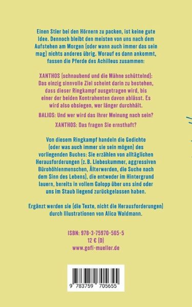 Einen Stier bei den Hörnern zu packen, ist keine gute Idee. Dennoch bleibt den meisten von uns nach dem Aufstehen am Morgen (oder wann auch immer das sein mag) nichts anderes übrig. Worauf es dann ankommt, fassen die Pferde des Achilleus zusammen:XANTHOS (schnaubend und die Mähne schüttelnd): Das einzig sinnvolle Ziel scheint darin zu bestehen, dass dieser Ringkampf ausgetragen wird, bis einer der beiden Kontrahenten davon ablässt. Es wird also obsiegen, wer länger durchhält.BALIOS: Und wer wird das Ihrer Meinung nach sein?XANTHOS: Das fragen Sie ernsthaft?Von diesem Ringkampf handeln die Gedichte (oder was auch immer sie sein mögen) des vorliegenden Buches: Sie erzählen von alltäglichen Herausforderungen (z. B. Liebeskummer, aggressiven Bürohöhlenmenschen, Älterwerden, der Suche nach dem Sinn des Lebens), die entweder im Hintergrund lauern, bereits in vollem Galopp über uns sind oder uns im Staub liegend zurückgelassen haben.Ergänzt werden sie (die Texte, nicht die Herausforderungen) durch Illustrationen von Alica Waldmann.