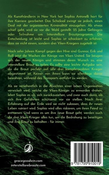 Als Kunsthändlerin in New York hat Sophia Antonelli hart für ihre Karriere gearbeitet. Das Schicksal zwingt sie jedoch, einen Deal mit der organisierten Kriminalität einzugehen. Als etwas schief geht, wird sie vor die Wahl gestellt: 25 Jahre Gefängnis oder Teilnahme am Interstellare Brautprogramm. Die Entscheidung ist leicht und Sophia ist schockiert zu erfahren, dass sie nicht einem, sondern drei Viken-Kriegern zugeteilt ist. Nach zehn Jahren Kampf gegen den Hive sind Gunnar, Erik und Rolf jetzt die Wachen der Könige von Viken United. Sie beugen sich der neuen Königin und stimmen deren Wunsch zu, eine interstellare Braut zu teilen. Es sollte eine leichte Aufgabe sein, da die Braut perfekt auf alle drei kampferprobten Krieger abgestimmt ist. Keiner von ihnen kann sie allerdings davor bewahren, während des Transports entführt zu werden. Als sie versehentlich in die Absichten einer bösen Organisation verwickelt wird, welche die Viken-Königin zu ermorden drohen, lehnt Sophia es ab, sich zurückzuziehen, und zwar auch dann, als sich ihre Gefährten schützend vor sie stellen. Nach ihrer Erfahrung auf der Erde wird sie nicht zulassen, dass ihr neues Leben ruiniert wird. Sophia wird alles riskieren, um ihren Feind zu enttarnen. Und wenn es um ihre neue Braut geht, werden auch die drei Viken-Krieger alles tun, um die Bedrohung zu beseitigen und ihre Braut zu behalten - für immer.