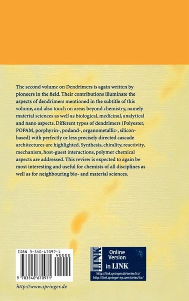 The second volume on Dendrimers is again written by pioneers in the field. Their contributions illuminate the aspects of dendrimers mentioned in the subtitle of this volume, and also touch on areas beyond chemistry, namely material sciences as well as biological, medicinal, analytical and nano aspects. Different types of dendrimers (Polyester, POPAM, porphyrin-, podand-, organometallic-, silicon-based) with perfectly or less precisely directed cascade architectures are highlighted. Synthesis, chirality, reactivity, mechanism, host-guest interactions, polymer chemical aspects are addressed. This review is expected to again be most interesting and useful for chemists of all disciplines as well as for neighbouring bio- and material sciences.
