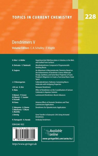 PH. Mori, A. M¿ller: Hyperbranched (Meth)acrylates in Solution, in the Melt, and Grafted From Surfaces.- K. Onitsuka, S. Takahashi: Metallodendrimers Composed of Organometallic Building Blocks.- K. Sugiura: An Adventure in Macromolecular Chemistry Based on the Achievements of Dendrimer Science: Molecular Design, Synthesis, and Some Basic Properties of Cyclic Porphyrin Oligomers to Create a Functional Nano-Sized Space.- J.-F. Nierengarten: Fullerodendrimers: Fullerene-Containing Macromolecules with Intriguing Properties.- J.W. Lee, K. Kim: Rotaxane Dendrimers.- K. Naka: Effect of Dendrimers on the Crystallization of Calcium Carbonate in Aqueous Solution.- V. Balzani, P. Ceroni, M. Maestri, C. Saudan, V. Vicinelli: Luminescent Dendrimers. Recent Advances.- M. Kawa: Antenna Effects of Aromatic Dendrons and Their Luminescene Applications.- S. Yokoyama, A. Otomo, T. Nakahama, Y. Okuno, S. Mashiko: Dendrimers for Optoelectronic Applications.- J. Dennig: Gene Transfer in Eukaryotic Cells Using Activated Dendrimers.- H. Yamaguchi, A. Harada: Antibody Dendrimers./P