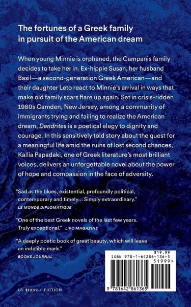 World Literature Today’s Notable Translation of 2024 Winner of the 2017 European Union Prize for Literature for readers of Min Jin Lee and The Namesake by Jhumpa Lahiri When young Minnie is orphaned, the Campanis family decides to take her in. Ex-hippie Susan and her husband Basil, a second-generation Greek American, along with their daughter Leto react to Minnie’s arrival in ways that make old family scars flare up again. Set in crisis-ridden 1980s Camden, New Jersey, among a community of immigrants trying and failing to realize the American dream, Dendrites is a poetical elegy to dignity and courage. In this sensitively told story about the quest for a meaningful life amid the ruins of lost second chances, Kallia Papadaki, one of Greek literature’s most brilliant voices, delivers an unforgettable novel about the power of hope and compassion in the face of adversity.