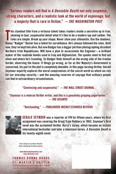 GERALD SEYMOUR was a reporter at ITN for fifteen years, where his first assignment was covering the Great Train Robbery in 1963. He later covered events in Vietnam, Borneo, Aden, Israel and Northern Ireland. Seymour was on the streets of Londonderry on the afternoon of Bloody Sunday, and was a witness to the massacre of Israeli athletes at the Munich Olympics. Seymour's first novel was the acclaimed thriller Harry's Game, set in Belfast, which became an instant international bestseller and later a television series. Six of Seymour's thrillers have now been filmed for television in the UK and US. A Deniable Death is his twenty-eighth novel.