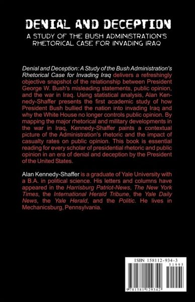 Denial and Deception: A Study of the Bush Administration's Rhetorical Case for Invading Iraq delivers a refreshingly objective snapshot of the relationship between President George W. Bush's misleading statements, public opinion, and the war in Iraq. Using statistical analysis, Alan Kennedy-Shaffer presents the first academic study of President Bush's efforts to bully the nation into invading Iraq and why the White House no longer controls public opinion. By mapping the major rhetorical and military developments in the war in Iraq, Kennedy-Shaffer paint a contextual picture of the Administration's rhetoric and the impact of casualty rates on public opinion. This book is essential reading for every scholar of presidential rhetoric and public opinion in an era of denial and deception by the President of the United States.