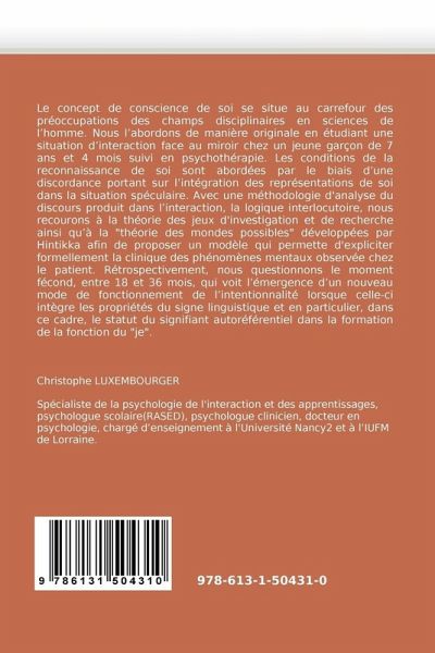 Le concept de conscience de soi se situe au carrefour des préoccupations des champs disciplinaires en sciences de l''homme. Nous l''abordons de manière originale en étudiant une situation d''interaction face au miroir chez un jeune garçon de 7 ans et 4 mois suivi en psychothérapie. Les conditions de la reconnaissance de soi sont abordées par le biais d''une discordance portant sur l''intégration des représentations de soi dans la situation spéculaire. Avec une méthodologie d''analyse du discours produit dans l''interaction, la logique interlocutoire, nous recourons à la théorie des jeux d''investigation et de recherche ainsi qu''à la "théorie des mondes possibles" développées par Hintikka afin de proposer un modèle qui permette d''expliciter formellement la clinique des phénomènes mentaux observée chez le patient. Rétrospectivement, nous questionnons le moment fécond, entre 18 et 36 mois, qui voit l''émergence d''un nouveau mode de fonctionnement de l''intentionnalité lorsque celle-ci intègre les propriétés du signe linguistique et en particulier, dans ce cadre, le statut du signifiant autoréférentiel dans la formation de la fonction du "je".
