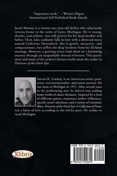 Jacob Maxson is a twenty-one-year-old drifter who reluctantly returns home to the town of Lynx, Michigan. He is young, slender, and athletic, but still grieves for his dead mother and father. Then, Jake suddenly falls in love with a divorced nurse named Catherine Havenbeck. She is gentle, attractive, and compassionate, but suffers the deep burdens from her ill-fated marriage. However, a growing terror leads them on a harrowing journey through an unspeakable shroud of horror. This poetic story and many of the author's literary works await the reader in Denizens of the Dark Eyes.
