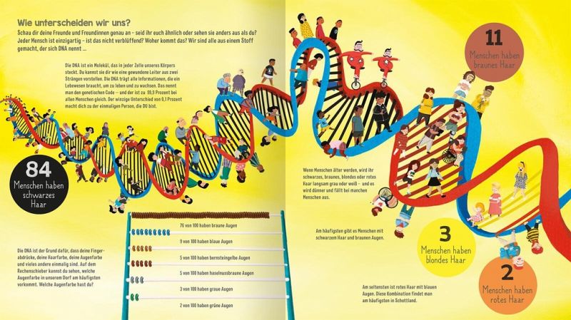 Wenn auf der Welt nur 100 Menschen leben würden, hätten 2 von ihnen rote Haare. Dieses Kindersachbuch bricht die gesamte Weltbevölkerung herunter auf nur 100 Menschen und macht so die unvorstellbare Zahl von etwa 8 Milliarden Menschen, die auf der Welt leben, begreifbar. Wie leben diese 100 Menschen? Wie viele von ihnen sind Kinder? Wie viele leben in Afrika? Wie viele können lesen oder haben Zugang zu elektrischem Strom?