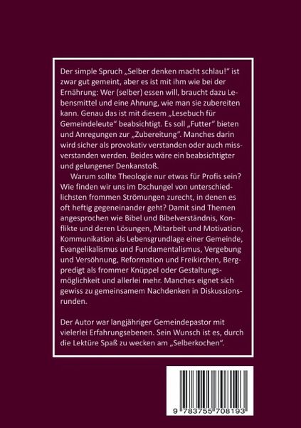 Der simple Spruch "Selber denken macht schlau!" ist zwar gut gemeint, aber es ist mit ihm wie bei der Ernährung: Wer(selber) essen will, braucht dazu Lebensmittel und eine Ahnung, wie man sie zubereiten kann. Genau das ist mit diesem "Lesebuch für Gemeindeleute" beabsichtigt. Es soll "Futter" bieten und Anregungen zur "Zubereitung". Manches darin wird sicher als provokativ verstanden oder auch missverstanden werden. Beides wäre ein beabsichtigter und gelungener Denkanstoß. Warum sollte Theologie nur etwas für Profis sein? Wie finden wir uns im Dschungel von unterschiedlichsten frommen Strömungen zurecht, in denen es oft heftig gegeneinander geht. Damit sind Themen angesprochen wie Bibel und Bibelverständnis, Konflikte und deren Lösungen, Mitarbeit und Motivation, Kommunikation als Lebensgrundlage einer Gemeinde, Evangelikalismus und Fundamentalismus, Vergebung und Versöhnung, Reformation und Freikirchen, Bergpredigt als frommer Knüppel oder Gestaltungsmöglichkeit und allerlei mehr. Manches eignet sich gewiss zu gemeinsamem Nachdenken in Diskussionsrunden.