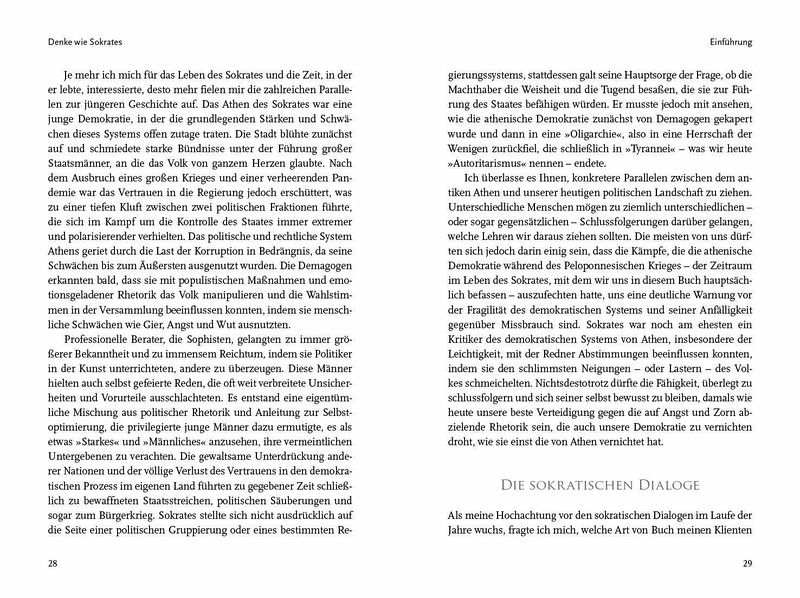 Sokrates ist der Inbegriff des griechischen Philosophen, der Begründer der gesamten westlichen philosophischen Tradition und der Pate der Stoiker. Er verbrachte sein Leben damit, die einfachen Menschen in den Straßen Athens praktische Philosophie zu lehren, und er war davon überzeugt, dass jeder Mensch das Potenzial hat, zu lernen und sich weiterzuentwickeln. Er betrachtete sich selbst nicht als Lehrer im herkömmlichen Sinne, sondern eher als eine Art Geburtshelfer für das Wissen seiner Mitmenschen. Seine Methode bestand darin, Menschen dazu zu bringen, ihre eigenen Überzeugungen zu hinterfragen und so ihre eigenen Antworten zu finden. Doch wie können wir heute die Lehren des größten antiken Philosophen auf das moderne Leben anwenden? Donald J. Robertson entführt die Leser in das antike Athen und zeigt einen Philosophen, der materielle Vergnügungen mied und selbst im Angesicht von Kontroversen mit einer Standhaftigkeit zu seinen Überzeugungen stand, die schließlich zu seiner Hinrichtung führte. Das Buch ist ein informativer Leitfaden für das Leben eines der größten Denker der Geschichte, der sich zudem auf die Anwendung der sokratischen Prinzipien auf unser tägliches Leben konzentriert. Als praktizierender Psychotherapeut im Bereich der kognitiven Verhaltenstherapie nutzt Robertson sein Fachwissen, um viele Parallelen zwischen den Konzepten und Techniken der modernen Psychologie und der Philosophie von Sokrates aufzuzeigen, und zeigt, wie seine philosophischen Erkenntnisse uns alle bis heute leiten und wie sie uns nützen können.