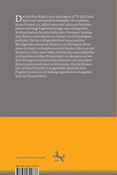 Die Schriften Rahel Levin Varnhagens (1771-1833) sind ästhetisch und thematisch komplex. Sie umfassen kleine Formen, u.a. Aphorismen und Lektürereflexionen, ebenso wie lange Tagebucheinträge und umfangreiche Briefwechsel mit beinahe dreihundert Personen. Auszüge ihrer Texte wurden bereits zur Lebzeit Levin Varnhagens publiziert. Die im vorliegenden Band versammelten Beiträge zielen darauf ab, Rahel Levin Varnhagens Texte sowie die damit verknüpften weitreichenden Lektüren und Kontexte in ihren materiellen, ästhetischen, poetologischen und soziohistorischen Dimensionen zu erkunden und vor dem Hintergrund romantischer Konzepte und epistolarer Kommunikationsformen zu diskutieren. Darüber hinaus gibt der Band Einblick in ausgewählte Handschriften (Tagebuch A) sowie in ein bislang unpubliziertes Ausgabenbuch der Romantikerin.