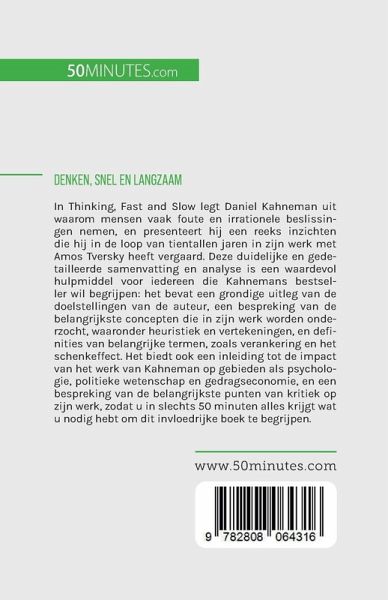 In Thinking, Fast and Slow legt Daniel Kahneman uit waarom mensen vaak foute en irrationele beslissingen nemen, en presenteert hij een reeks inzichten die hij in de loop van tientallen jaren in zijn werk met Amos Tversky heeft vergaard. Deze duidelijke en gedetailleerde samenvatting en analyse is een waardevol hulpmiddel voor iedereen die Kahnemans bestseller wil begrijpen: het bevat een grondige uitleg van de doelstellingen van de auteur, een bespreking van de belangrijkste concepten die in zijn werk worden onderzocht, waaronder heuristiek en vertekeningen, en definities van belangrijke termen, zoals verankering en het schenkeffect. Het biedt ook een inleiding tot de impact van het werk van Kahneman op gebieden als psychologie, politieke wetenschap en gedragseconomie, en een bespreking van de belangrijkste punten van kritiek op zijn werk, zodat u in slechts 50 minuten alles krijgt wat u nodig hebt om dit invloedrijke boek te begrijpen. Over Thinking, Fast and Slow : Thinking, Fast and Slow identificeert twee denksystemen, aangeduid als Systeem 1 en Systeem 2, die bepalen hoe we informatie verwerken en beslissingen nemen. Dit zijn respectievelijk de "snelle" en "trage" uit de titel, en zij werken met elkaar samen om ons te helpen keuzes te maken. Het boek onderzoekt ook de vooroordelen en denkfouten die mensen ertoe brengen irrationeel te handelen, geïllustreerd met case studies en voorbeelden uit de praktijk. Over Daniel Kahneman : Daniel Kahneman is een Israëlisch-Amerikaanse psycholoog en econoom. Hij is vooral bekend om zijn langdurige samenwerking met de psycholoog Amos Tversky, met wie hij het onderzoek naar besluitvorming uitvoerde dat hem in 2002 de Nobelprijs voor economische wetenschappen opleverde. Zijn onderzoek, in het bijzonder zijn samenwerking door de jaren heen met Richard Thaler, de Nobelprijswinnaar van 2017, heeft een belangrijke rol gespeeld bij de oprichting van het vakgebied van de gedragseconomie. Kahneman is momenteel emeritus hoogleraar psychologie en publieke zaken aan de Princeton University.