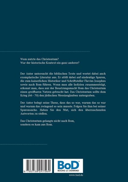 Das Christentum wurde im Interesse der römische Besatzungsmacht geschaffen, um den Messias-Glauben der Juden zu untergraben. Das Christentum ist somit keine Religion, die sich aus dem Judentum entwickelt hat, sondern eine literarische Schöpfung, die in Rom unter Federführung des Flavius Josephus konzipiert wurde. Die These einer römischen Schreibstube lässt sich anhand der Texte bis heute belegen.Die Römer hatten im Jahr 70 die Juden besiegt, aber noch nicht endgültig befriedet. Die Juden glaubten in dieser Zeit weiterhin, dass sie trotz der Niederlage das auserwählte Volk Gottes seien und ein Messias in Gestalt eines Heerführers sie von der römischen Fremdherrschaft befreien würde. Um dieser Gefahr zu begegnen, wurde eine Idee geschaffen, die diese Erwartung untergraben sollte. So entstanden in einer römischen Schreibstube die synoptischen Evangelien mit der Figur eines Jesus, der die Erwartungshaltung der Juden auffangen sollte. Kriegsereignisse aus dem Jüdischen Krieg wurden zur Verherrlichung des Kaiserhauses und des Sohn des römischen Gottkaisers Vespasian um 40 Jahre zurückdatiert und in eine religiöse Friedensbotschaft umgeschrieben. Der jüdische Messias sollte scheitern und der römische Christus die religiöse Herrschaft über die Juden antreten. Wie man eine derartige Erfindung tatsächlich konstruieren konnte, ist eine spannende Spurensuche. Die Belege und Indizien für diese Entdeckung stellen das Christentum radikal in Frage.