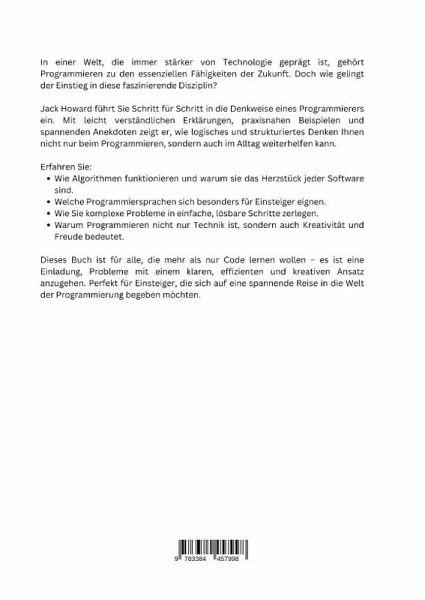 In einer Welt, die immer stärker von Technologie geprägt ist, gehört Programmieren zu den essenziellen Fähigkeiten der Zukunft. Doch wie gelingt der Einstieg in diese faszinierende Disziplin?Jack Howard führt Sie Schritt für Schritt in die Denkweise eines Programmierers ein. Mit leicht verständlichen Erklärungen, praxisnahen Beispielen und spannenden Anekdoten zeigt er, wie logisches und strukturiertes Denken Ihnen nicht nur beim Programmieren, sondern auch im Alltag weiterhelfen kann.Erfahren Sie:Wie Algorithmen funktionieren und warum sie das Herzstück jeder Software sind.Welche Programmiersprachen sich besonders für Einsteiger eignen.Wie Sie komplexe Probleme in einfache, lösbare Schritte zerlegen.Warum Programmieren nicht nur Technik ist, sondern auch Kreativität und Freude bedeutetDieses Buch ist für alle, die mehr als nur Code lernen wollen - es ist eine Einladung, Probleme mit einem klaren, effizienten und kreativen Ansatz anzugehen. Perfekt für Einsteiger, die sich auf eine spannende Reise in die Welt der Programmierung begeben möchten.