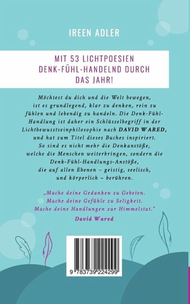 Möchtest du dich und die Welt bewegen, dann ist es grundlegend, klar zu denken, rein zu fühlen und lebendig zu handeln. Daher ist der Begriff der Denk-Fühl-Handlung einer der Schlüsselbegriffe der Lichtbewusstseinphilosophie nach DAVID WARED, und hat zum Titel dieses Buches inspiriert.Der Philosophie des Lichtbewusstsein zu Folge reicht es nicht mehr aus, den Menschen Denkanstöße zu geben, wenn es darum geht, den Herausforderungen der heutigen Zeit verantwortlich und nachhaltig zu begegnen. Vielmehr ist es wesentlich, die Menschen mit Denk-Fühl-Handlungs-Anstößen und damit ganzheitlich, auf geistiger, seelischer und lebendiger Ebene, zu berühren. Jeder denk-fühl-handelnde Mensch ist ein Anstoß zu einer wundersamen Verwandlung seiner Mitmenschen: ihrer Gedanken, ihrer Gefühle und ihrer Handlungsweisen."Mache deine Gedanken zu Gebeten.Mache deine Gefühle zu Seligkeit.Mache deine Handlungen zur Himmelstat."David Wared