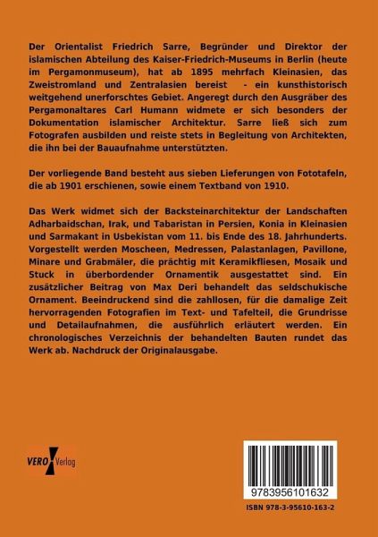 Das Werk widmet sich der Backsteinarchitektur der Landschaften Adharbaidschan, Irak, und Tabaristan in Persien, Konia in Kleinasien und Sarmakant in Usbekistan vom 11. bis Ende des 18. Jahrhunderts. Vorgestellt werden Moscheen, Medressen, Palastanlagen, Pavillone, Minare und Grabmäler, die prächtig mit Keramikfliesen, Mosaik und Stuck in überbordender Ornamentik ausgestattet sind. Ein zusätzlicher Beitrag von Max Deri behandelt das seldschukische Ornament. Beeindruckend sind die zahllosen, für die damalige Zeit hervorragenden Fotografien im Text- und Tafelteil, die Grundrisse und Detailaufnahmen, die ausführlich erläutert werden. Ein chronologisches Verzeichnis der behandelten Bauten rundet das Werk ab. Nachdruck der Originalausgabe.