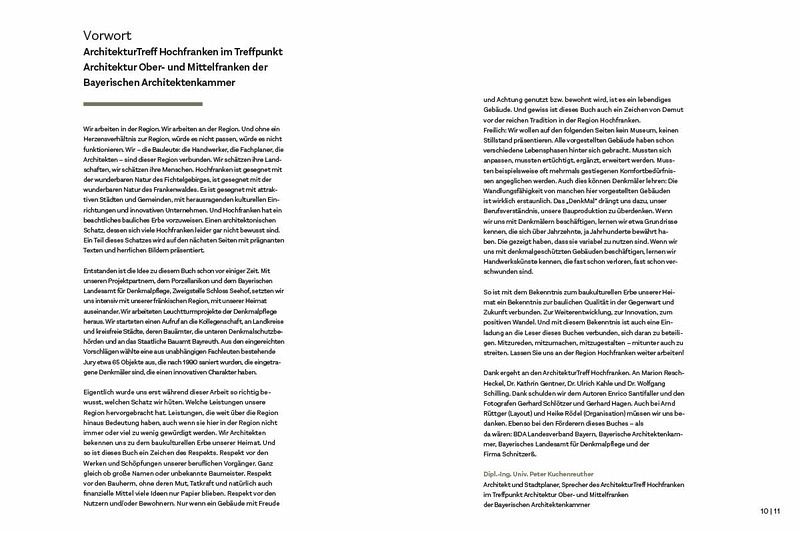 Denkmäler in Hochfranken bedeuten ein überwältigendes Spektrum an Farben und Formen, ein glanzvolles Fest für die Augen, eine eindrucksvolle Parade an erstaunlichen Schöpfungen.Die in diesem Buch vorgestellten mehr als 65 denkmalgeschützten Gebäude zeigen, dass man, um Baukunst zu sehen,nicht weit fahren muss. Es gibt sie vielfach um die Ecke, ganz selbstverständlich im Alltag, manchmal in Winkeln, in denen man es nicht erwartet hätte. Denkmäler erinnern an ihre Erbauer, an ursprünglichen Zweck und Nutzen, an Veränderung und Wechsel, an tiefen Fall und neuen Glanz. Sie erzählen lustige Geschichten, bisweilen traurige, überraschende undseltsame, Helden- und andere stolze Geschichten. Und insgesamt spiegeln sie die wechselhafte Geschichte Hochfrankens, schildern Spitzenleistungen und Herausforderungen.Diese Publikation ist ein Mut-mach-Buch. Das Mut-mach-Buch belegt, dass man keine Angst vor dem Denkmal haben muss. Es beweist, dass Vorbehalte gegenüber dem Denkmal zu überwinden sind und zeitgemäßer Wohnkomfort möglich ist. Und es bekundet, welcher Reichtum zu erfahren ist, wenn man sich auf die Geschichte einlässt. Das Mut-mach-Buchumfasst erfolgreiches Sanieren und Neunutzen von Gebäuden unterschiedlichen Charakters und verschiedener Stile. Es präsentiert ebenso glückliche wie mutige Denkmal-Eigentümer, die mit der Expertise von Architekten und Handwerkernteils herausragende Gebäude geschaffen haben. Und es weist nach, dass Hochfranken in den vergangenen Jahrzehnteneinen innovativen Umgang mit seinem baulichen Erbe vorweisen kann: Dieser verknüpft Heimat und Aufbruch, verbindetGeschichte und dringend benötigte Zukunftsfähigkeit.Initiator des ebenso couragierten wie couragierenden Projekts ist der ArchitekturTreff Hochfranken im Treffpunkt Architektur Ober- und Mittelfranken der Bayerischen Architektenkammer. Projektpartner sind das Bayerische Landesamt für Denkmalpflege, das Porzellanikon sowie eine Reihe unabhängiger Experten. Die in der Regel auf einer Doppelseite präsentierten Objekte wurden von einer Fachjury in Abstimmung mit dem Landesamt für Denkmalpflege und den Unteren Denkmalschutzbehörden ausgewählt. Als Autor konnte der preisgekrönte Architekturjournalist Enrico Santifaller gewonnenwerden, der bereits die beiden Bücher zur aktuellen Architektur in Oberfranken verfasst hatte. Die Mehrzahl der Bildersteuerten die Bamberger Fotografen Gerhard Schlötzer und Gerhard Hagen bei.