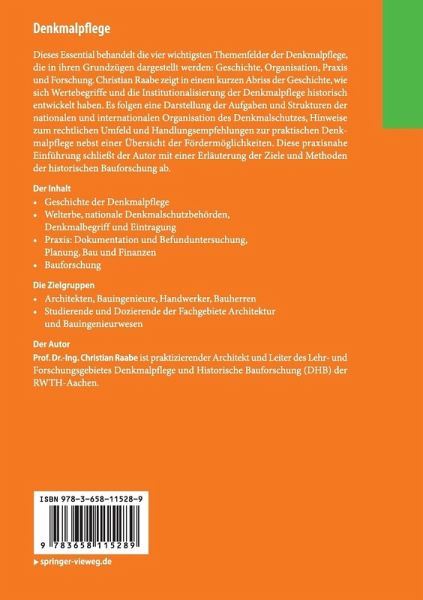 Dieses essential behandelt die vier wichtigsten Themenfelder der Denkmalpflege, die in ihren Grundzügen dargestellt werden: Geschichte, Organisation, Praxis und Forschung. Christian Raabe zeigt in einem kurzen Abriss der Geschichte, wie sich Wertebegriffe und die Institutionalisierung der Denkmalpflege historisch entwickelt haben. Es folgen eine Darstellung der Aufgaben und Strukturen der nationalen und internationalen Organisation des Denkmalschutzes, Hinweise zum rechtlichen Umfeld und Handlungsempfehlungen zur praktischen Denkmalpflege nebst einer Übersicht der Fördermöglichkeiten. Diese praxisnahe Einführung schließt der Autor mit einer Erläuterung der Ziele und Methoden der historischen Bauforschung ab.