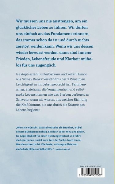 Wir müssen uns nie anstrengen, um ein glückliches Leben zu führen. Wir dürfen uns einfach an das Fundament erinnern, das immer schon da ist und durch nichts zerstört werden kann. Wenn wir uns dessen wieder bewusst werden, dann sind innerer Frieden, Lebensfreude und Klarheit mühelos für uns zugänglich.Isa Aepli erzählt unterhaltsam und voller Humor, wie Sidney Banks' Verständnis der 3 Prinzipien Leichtigkeit in ihr Leben gebracht hat. Familienalltag, Erziehung, die Vergangenheit und selbst grosse Lebensthemen wie das Sterben verlieren an Schwere, wenn wir wissen, aus welcher Richtung die Kraft kommt, die uns durch die Stürme des Lebens begleitet."Wer sich wünscht, dass seine Suche ein Ende hat, ist bei diesem Buch genau richtig. Ein Buch voller Witz und Leben. Isa Aepli plädiert für einen Richtungswechsel und führt die Leser:innen zurück zum Kern der Sache. Nach innen. Wo alles schon da ist. Die beste, wirkungsvollste und einfachste Hilfe zur Selbsthilfe."Lea Wernli