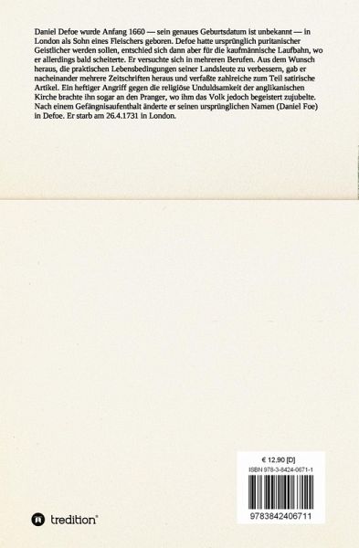 Daniel Defoe wurde Anfang 1660 - sein genaues Geburtsdatum ist unbekannt - in London als Sohn eines Fleischers geboren. Defoe hatte ursprünglich puritanischer Geistlicher werden sollen, entschied sich dann aber für die kaufmännische Laufbahn, wo er allerdings bald scheiterte. Er versuchte sich in mehreren Berufen. Aus dem Wunsch heraus, die praktischen Lebensbedingungen seiner Landsleute zu verbessern, gab er nacheinander mehrere Zeitschriften heraus und verfaßte zahlreiche zum Teil satirische ArtikeL Ein heftiger Angriff gegen die religiöse Unduldsamkeit der anglikanischen Kirche brachte ihn sogar an den Pranger, wo ihm das Volk jedoch begeistert zujubelte. Nach einem Gefängnisaufenthalt änderte er seinen ursprünglichen Namen (Daniel Foe) in Defoe. Er starb am 26.4.1731 in London