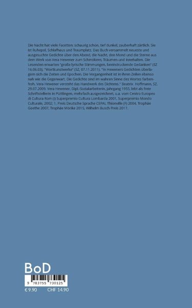 Die Nacht hat viele Facetten: schaurig schön, tief dunkel, zauberhaft zärtlich. Sie ist Ruhepol, Schlafhaus und Traumplatz. Das Buch versammelt neueste und ausgesuchte Gedichte über den Abend, die Nacht, den Mond und die Sterne aus dem Werk von Vera Hewener zum Schmökern, Träumen, Nachsinnen und Innehalten. Den Leser erwarten große lyrische Stimmungen, beeindruckende Gedanken (SZ 16.06.03), "Wortkunstwerke (SZ, 07.11.2011). In Heweners Gedichten überlagern sich die Zeiten und Epochen. Die Vergangenheit ist in ihren Zeilen ebenso nah wie die Gegenwart. Die Gedichte sind im wahren Sinne des Wortes farbenfroh. Vera Hewener versteht das Handwerk des Dichtens. Oft geht sie ungewöhnlich um mit ihrem Material. SZ, 29.07.2009 Beatrix Hoffmann. Vera Hewener, Dipl.-Sozialarbeiterin, Jahrgang 1955, lebt als freie Schriftstellerin in Püttlingen, mehrfach ausgezeichnet, u.a. vom Centro Europeo di Cultura Rom (I) Superpremio Cultura Lombarda 2001, Superpremio Mondo Culturale, 2002; 1. Preis Deutsche Sprache CEPAL Thionville (F) 2004, Trophäe Goethe 2007, Trophäe Mörike 2015, Wilhelm Busch Preis 2017.