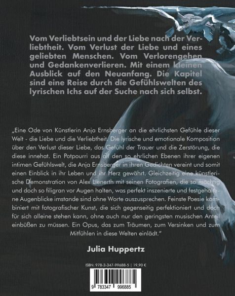 Vom Verliebtsein und der Liebe nach der Verliebtheit. Vom Verlust der Liebe und eines geliebten Menschen. Vom Verlorengehen und Gedankenverlieren. Mit einem kleinen Ausblick auf den Neuanfang. Die Kapitel sind eine Reise durch die Gefühlswelten des lyrischen Ichs auf der Suche nach sich selbst.Die ruhige Atmosphäre der Gedichte wird verstärkt durch künstlerisch wertvolle Fotografien. Sie unterstützen den Leser, sich in die Texte hineinzuversetzen und sie zu erleben, statt nur zu lesen.