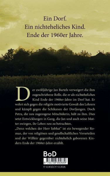 Der zwölfjährige Jan Bartels verweigert die ihm zugeschriebene Rolle, die er als nichteheliches Kind Ende der 1960er-Jahre im Dorf hat. Er wehrt sich gegen die religiös motivierte Gewalt des Lehrers und kämpft gegen die Schikanen der Dorfjungen. Doch Petra, die neu zugezogene Mitschülerin, hält zu ihm. Dies setzt Entwicklungen in Gang, die Jan und auch seine Mutter zwingen, ihr Leben neu zu betrachten. 'Denn welchen der Herr liebhat' ist ein bewegender Roman, der von religiösen und gesellschaftlichen Vorurteilen und der Willkür gegenüber nichtehelich geborenen Kindern Ende der 1960er-Jahre erzählt.