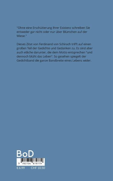 "Ohne eine Erschütterung Ihrer Existenz schreiben Sie entweder gar nicht oder nur über Blümchen auf der Wiese."Dieses Zitat von Ferdinand von Schirach trifft auf einen großen Teil der Gedichte und Gedanken zu. Es sind aber auch etliche darunter, die dem Motto entsprechen "und dennoch blüht das Leben". So gesehen spiegelt der Gedichtband die ganze Bandbreite eines Lebens wider.