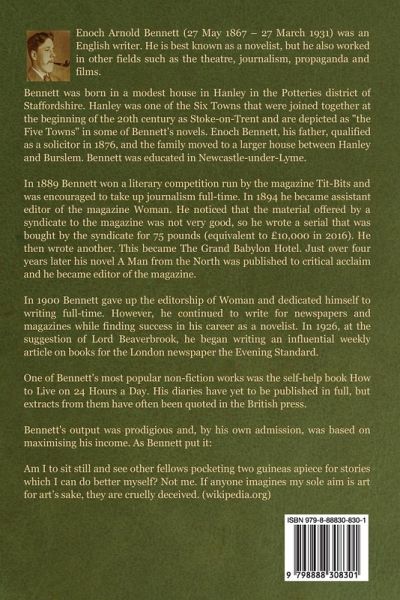 This is the humorous tale of Edward Henry Machin (his mother "saved a certain amount of time each day by addressing her son as Denry"), set in a small industrial town at the start of the 20th century. Denry is an impulsive, opportunistic and occasionally lucky entrepreneur, with few morals where business is concerned. He is not especially likeable, but nor is he ludicrously unpleasant and he is an entertaining character to townsfolk as well as readers. ...(Cecily) About the Author: Enoch Arnold Bennett (27 May 1867 - 27 March 1931) was an English writer. He is best known as a novelist, but he also worked in other fields such as the theatre, journalism, propaganda and films. Bennett was born in a modest house in Hanley in the Potteries district of Staffordshire. Hanley was one of the Six Towns that were joined together at the beginning of the 20th century as Stoke-on-Trent and are depicted as "the Five Towns" in some of Bennett's novels. Enoch Bennett, his father, qualified as a solicitor in 1876, and the family moved to a larger house between Hanley and Burslem. Bennett was educated in Newcastle-under-Lyme. In 1889 Bennett won a literary competition run by the magazine Tit-Bits and was encouraged to take up journalism full-time. In 1894 he became assistant editor of the magazine Woman. He noticed that the material offered by a syndicate to the magazine was not very good, so he wrote a serial that was bought by the syndicate for 75 pounds (equivalent to £10,000 in 2016). He then wrote another. This became The Grand Babylon Hotel. Just over four years later his novel A Man from the North was published to critical acclaim and he became editor of the magazine. In 1900 Bennett gave up the editorship of Woman and dedicated himself to writing full-time. However, he continued to write for newspapers and magazines while finding success in his career as a novelist. In 1926, at the suggestion of Lord Beaverbrook, he began writing an influential weekly article on books for the London newspaper the Evening Standard. One of Bennett's most popular non-fiction works was the self-help book How to Live on 24 Hours a Day. His diaries have yet to be published in full, but extracts from them have often been quoted in the British press. Bennett's output was prodigious and, by his own admission, was based on maximising his income. As Bennett put it: Am I to sit still and see other fellows pocketing two guineas apiece for stories which I can do better myself? Not me. If anyone imagines my sole aim is art for art's sake, they are cruelly deceived. (wikipedia.org)