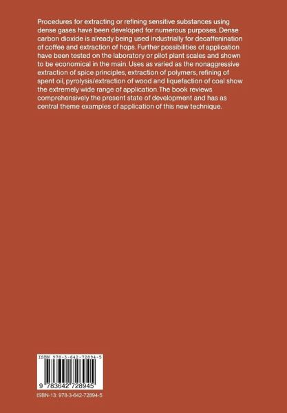 Procedures for extracting or refining sensitive substances using dense gases have been developed for numerous purposes. Dense carbon dioxide is already being used industrially for decaffeination of coffee and extraction of hops. Further possible applications have been tested on the laboratory or pilot plant scales and shown to be mostly economical. Uses as varied as the non-aggressive extraction of spice, extraction of polymers, refining of spent oil, pyrolysis/extraction of wood and liquefaction of coal show the extremely wide range of application. The book comprehensively reviews the present state of development and features examples of application of this new technique.