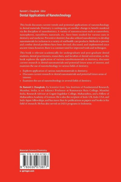 Nanomaterials in Regenerative Pulp Treatment.- Nanobiomaterials and Their Role in Periodontal Rehabilitation.- Advanced Nanomaterials and Their Functionalization in Clinical Endodontics.- Nanocomposites and their Use in Dentistry.- Applications of Nanoparticles in Orthodontics.- Nanomaterials: A Boon to Prosthodontics.- Nanomaterials: The Changing Phase of Prosthodontics.- Therapeutic Nanostructures in Dentistry: Role in Diagnosis, Drug Delivery, Oral Cancer Therapy, and Biocompatibility.- Nanotechnology in Orthodontics - Futuristic Approach.- Nanobiomaterials and their Applications in Prosthodontics.- Nanomaterials for the Management of Periodontal Diseases.- Oral biofilms: From Development to Assessment and Treatment.- Physical Properties and Biocompatibility of Nanostructural Biomaterials Based on Active Calcium Silicate Systems and Hydroxyapatite.