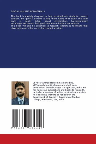 DENTAL IMPLANT BIOMATERIALSThis book is specially designed to help prosthodontic students, research scholars, and general dentists to help them during their study. This book gives in depth details about classification, biocompatibility, anchorage mechanism, biological response to implant biomaterials.This book will also be beneficial to research scholars to formulate their dissertation and other curriculum related activities.