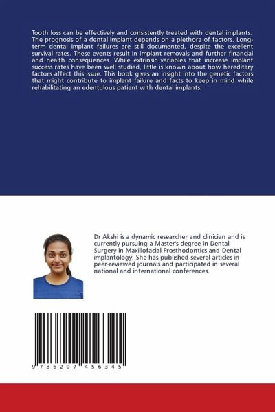 Tooth loss can be effectively and consistently treated with dental implants. The prognosis of a dental implant depends on a plethora of factors. Long-term dental implant failures are still documented, despite the excellent survival rates. These events result in implant removals and further financial and health consequences. While extrinsic variables that increase implant success rates have been well studied, little is known about how hereditary factors affect this issue. This book gives an insight into the genetic factors that might contribute to implant failure and facts to keep in mind while rehabilitating an edentulous patient with dental implants.