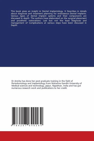 This book gives an insight in Dental Implantology. It Describes in details about diagnosis and treatment planning for endosseous Dental Implants. Various types of dental Implant systems and their components are discussed in depth. The authors have elaborated on the surgical placement and prosthetic restorations. Last but not the least Diagnosis and management of Complications at various steps have been discussed in Depth.