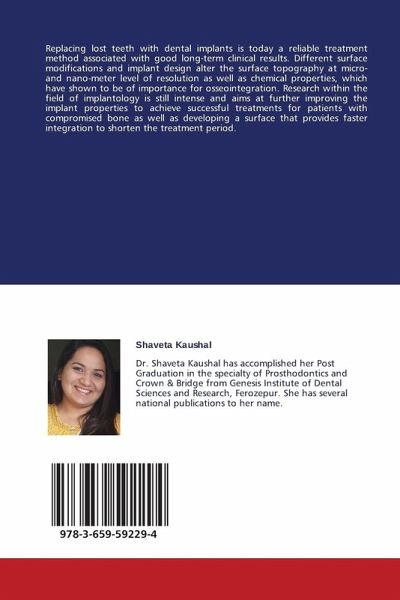 Replacing lost teeth with dental implants is today a reliable treatment method associated with good long-term clinical results. Different surface modifications and implant design alter the surface topography at micro- and nano-meter level of resolution as well as chemical properties, which have shown to be of importance for osseointegration. Research within the field of implantology is still intense and aims at further improving the implant properties to achieve successful treatments for patients with compromised bone as well as developing a surface that provides faster integration to shorten the treatment period.…mehr