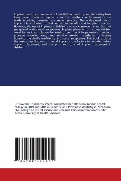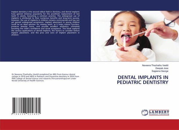 Implant dentistry is the second oldest field in dentistry, and dental implants have gained immense popularity for the prosthetic replacement of lost teeth in adults, becoming a common practice. The widespread use of implants is attributed to their numerous benefits and long-term success. However, the use of implants in children remains controversial and has not yet gained widespread acceptance. Implant placement in young children could be an ideal solution for missing teeth, as it helps restore function, preserve alveolar bone, and provide excellent aesthetics, ultimately boosting the child's confidence and social acceptance. This book explores the various applications of dental implants, the factors to consider before implant placement, and the pros and cons of implant placement in children.