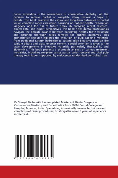 Caries excavation is the cornerstone of conservative dentistry, yet the decision to remove partial or complete decay remains a topic of debate. This book examines the clinical and long-term outcomes of partial versus complete caries excavation, focusing on patient health, restoration longevity, and the risk of future decay. By analyzing recent research, clinical data, and expert perspectives, this book helps dental professionals navigate the delicate balance between preserving healthy tooth structure and ensuring thorough caries removal for optimal outcomes. This authoritative resource explores the evolution of pulp capping materials, from traditional calcium hydroxide to cutting-edge bioactive materials like calcium silicate and glass ionomer cement. Special attention is given to the latest developments in bioactive materials, particularly TheraCal LC and Biodentine. This book presents a thorough analysis of various treatment modalities, including complete versus partial caries removal and vital pulp therapy techniques, supported by multicenter randomized controlled trials.