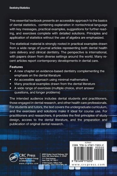 The intended audience includes dental students and practitioners, those engaged in dental research and other health care professionals. For students and tutors, it covers the undergraduate curriculum, and the exercises and solutions make it ideal for course use.For practitioners and researchers it provides the first principles of study design, accessing the dental literature, and the preparation and publication of original dental research.