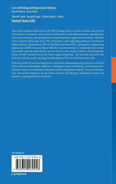 This book explores Dental Stem Cell (DSC) biology, from a review of basic concepts for cell culture, to isolation, self-renewal, multipotency and differentiation, regulation by molecular medicine, and prospective research areas for regenerative medicine. The first seven chapters delve into basic DSC properties, vital signaling pathways involved in differentiation, pluripotency, iPS cell development from DSCs, and genetic engineering approaches of DSCs in accordance with the current literature. A comprehensive review of possible clinical applications and in vitro/in vivo studies follows, illustrating the future of DSC research for in the tissue engineering field. The text also discusses the political, ethical, social, and legal ramifications of the use of dental stem cells. Expertly authored and drawing from a multitude of international perspectives, Dental Stem Cells is an invaluable addition to Springer's Stem Cell Biology and Regenerative Medicine series. It is essential reading for advanced graduate students, basic researchers, and clinical investigators in the fields of stem cell therapy, biological sciences of dentistry, and regenerative medicine.