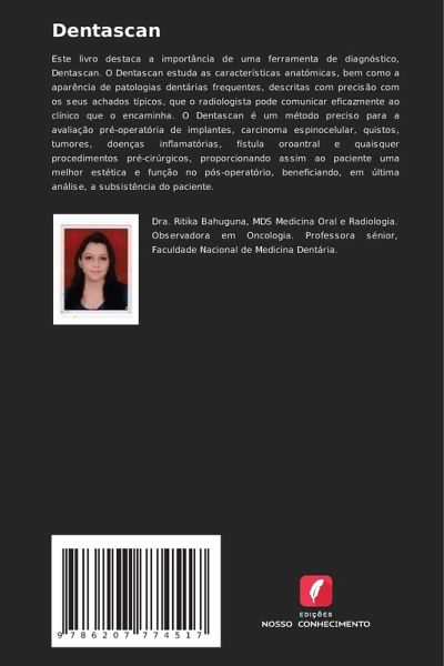 Este livro destaca a importância de uma ferramenta de diagnóstico, Dentascan. O Dentascan estuda as características anatómicas, bem como a aparência de patologias dentárias frequentes, descritas com precisão com os seus achados típicos, que o radiologista pode comunicar eficazmente ao clínico que o encaminha. O Dentascan é um método preciso para a avaliação pré-operatória de implantes, carcinoma espinocelular, quistos, tumores, doenças inflamatórias, fístula oroantral e quaisquer procedimentos pré-cirúrgicos, proporcionando assim ao paciente uma melhor estética e função no pós-operatório, beneficiando, em última análise, a subsistência do paciente.