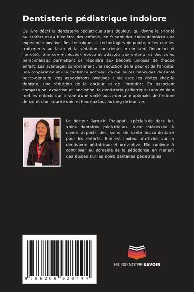 Ce livre décrit la dentisterie pédiatrique sans douleur, qui donne la priorité au confort et au bien-être des enfants, en faisant des soins dentaires une expérience positive. Des techniques et technologies de pointe, telles que les traitements au laser et la sédation consciente, minimisent l'inconfort et l'anxiété. Une communication douce et adaptée aux enfants et des soins personnalisés permettent de répondre aux besoins uniques de chaque enfant. Les avantages comprennent une réduction de la peur et de l'anxiété, une coopération et une confiance accrues, de meilleures habitudes de santé bucco-dentaire, des associations positives à vie avec les visites chez le dentiste, une réduction de la douleur et de l'inconfort. En associant compassion, expertise et innovation, la dentisterie pédiatrique sans douleur met les enfants sur la voie d'une santé bucco-dentaire optimale, de l'estime de soi et d'un sourire sain et heureux tout au long de leur vie.