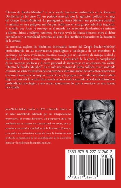 "Dentro de Baader-Meinhof" es una novela fascinante ambientada en la Alemania Occidental de los años 70, un período marcado por la agitación política y el auge del Grupo Baader-Meinhof. La protagonista, Anna Richter, una periodista decidida, se embarca en una peligrosa misión para infiltrarse en este grupo radical de izquierda. A medida que Anna se sumerge en el mundo del activismo clandestino, se enfrenta a dilemas éticos y peligros extremos. Su viaje revela las líneas borrosas entre el deber periodístico y la moralidad personal, así como los sacrificios necesarios en la búsqueda de la verdad. La narrativa explora las dinámicas intrincadas dentro del Grupo Baader-Meinhof, profundizando en las motivaciones psicológicas e ideológicas de sus miembros. El personaje de Anna evoluciona mientras navega por un laberinto de intriga, lealtad y desilusión. El libro retrata magistralmente la intensidad de la época, la complejidad de las creencias políticas y el costo personal de interactuar en un entorno tan volátil. "Dentro de Baader-Meinhof" no es solo una historia de lucha política; es un profundo comentario sobre los desafíos de comprender e informar sobre movimientos extremistas, el costo de mantener las propias convicciones y la pregunta eterna de hasta dónde se debe llegar en busca de la verdad. Esta novela es una mezcla cautivadora de detalles históricos, profundidad psicológica y una trama apasionante, lo que la convierte en una lectura inolvidable.
