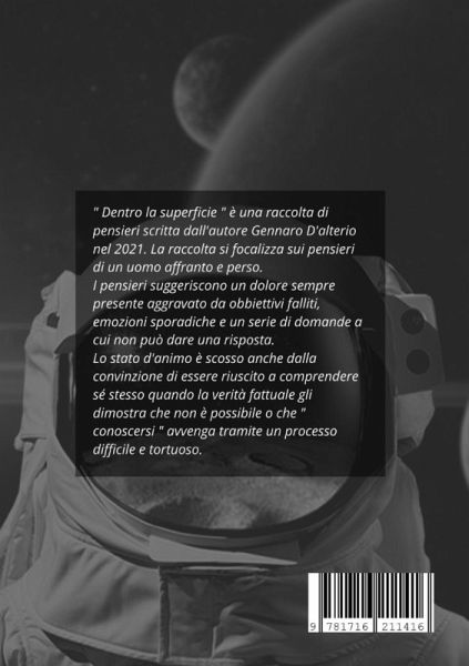 " Dentro la superficie " è una raccolta di pensieri scritta dall'autore Gennaro D'alterio nel 2021. La raccolta si focalizza sui pensieri di un uomo affranto e perso. I pensieri suggeriscono un dolore sempre presente aggravato da obbiettivi falliti, emozioni sporadiche e un serie di domande a cui non può dare una risposta. Lo stato d'animo è scosso anche dalla convinzione di essere riuscito a comprendere sé stesso quando la verità fattuale gli dimostra che non è possibile o che " conoscersi " avvenga tramite un processo difficile e tortuoso.