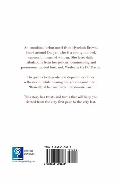 An emotional debut novel from Hyacinth Brown, based around Denyah who is a strong-minded successful married woman, she faces daily tribulations from her jealous, domineering and poisonous-minded husband; Wesley (a.k.a PC Davis). His goal is to degrade and deprive her of her self-esteem, while turning everyone against her. 'Basically if he can't have her, no-one can.' This story has twists and turns that will keep you riveted from the very first page to the very last.