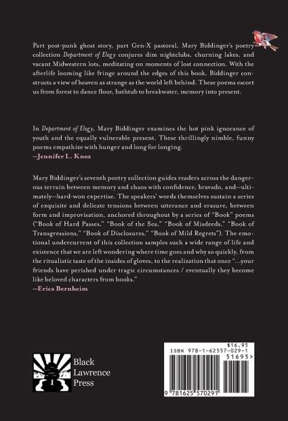 Part post-punk ghost story, part Gen-X pastoral, Mary Biddinger's poetry collection DEPARTMENT OF ELEGY conjures dim nightclubs, churning lakes, and vacant Midwestern lots, meditating on moments of lost connection. With the afterlife looming like fringe around the edges of this book, Biddinger constructs a view of heaven as strange as the world left behind. These poems escort us from forest to dance floor, bathtub to breakwater, memory into present. "In DEPARTMENT OF ELEGY, Mary Biddinger examines the hot pink ignorance of youth and the equally vulnerable present. These thrillingly nimble, funny poems empathize with hunger and long for longing." -Jennifer L. Knox "The Talking Heads once asked, 'How did I get here?' a rhetorical interrogation that happens at the very point where our past and present lives intersect. Time's fulcrum, and all its possibilities, even the imaginary ones, are the deep gothic heart that powers Mary Biddinger's DEPARTMENT OF ELEGY. This collection savors its sadness but never wallows in it, just as it asks the reader to take all the joys of the world and taste them. If an elegy is a song of mourning, these poems-with their abiding love for the human experience and a generous dollop of empathy-are an invitation to the most rollicking Irish wake you've ever attended. They remind us that we come together not only to mourn but also to celebrate the things that ask us to say goodbye." -Steve Kistulentz "Mary Biddinger's seventh poetry collection guides readers across the dangerous terrain between memory and chaos with confidence, bravado, and-ultimately-hard-won expertise. The speakers' words themselves sustain a series of exquisite and delicate tensions between utterance and erasure, between form and improvisation, anchored throughout by a series of 'Book' poems ('Book of Hard Passes,' 'Book of the Sea,' 'Book of Misdeeds,' 'Book of Transgressions,' 'Book of Disclosures,' 'Book of Mild Regrets'). The emotional undercurrent of this collection samples such a wide range of life and existence that we are left wondering where time goes and why so quickly, from the ritualistic taste of the insides of gloves, to the realization that once '...your friends have perished under tragic circumstances / eventually they become like beloved characters from books.'" -Erica Bernheim