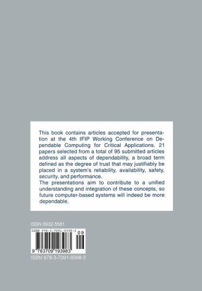 This volume contains the articles presented at the Fourth InternationallFIP Working Conference on Dependable Computing for Critical Applications held in San Diego, California, on January 4-6, 1994. In keeping with the previous three conferences held in August 1989 at Santa Barbara (USA), in February 1991 at Tucson (USA), and in September 1992 at Mondello (Italy), the conference was concerned with an important basic question: can we rely on computer systems for critical applications? This conference, like its predecessors, addressed various aspects of dependability, a broad term defined as the degree of trust that may justifiably be placed in a system's reliability, availability, safety, security and performance. Because of its broad scope, a main goal was to contribute to a unified understanding and integration of these concepts. The Program Committee selected 21 papers for presentation from a total of 95 submissions at a September meeting in Menlo Park, California. The resultingprogram represents a broad spectrum of interests, with papers from universities, corporations and government agencies in eight countries. The selection process was greatly facilitated by the diligent work of the program committee members, for which we are most grateful. As a Working Conference, the program was designed to promote the exchange of ideas by extensive discussions. All paper sessions ended with a 30 minute discussion period on the topics covered by the session. In addition, three panel sessions have been organizcd.