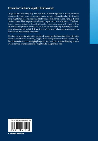 Organizations frequently rely on the support of external parties to access necessary resources. In many cases, the resulting buyer-supplier relationships last for decades; some might even become indispensable for one or both parties in achieving its desired business goals. These dependencies between organizations are ubiquitous. This book focuses on such instances, discussing them in a cumulative manner: It begins with an introduction of previous research on the issue, before empirically explaining the emergence of dependencies, their different forms of existence and management approaches as well as its development over time.