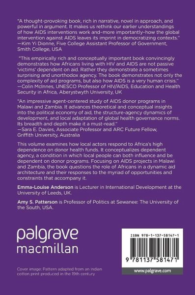 This volume examines how local actors respond to Africa's high dependence on donor health funds. It focuses on the large infusion of donor money to address HIV and AIDS into Malawi and Zambia and the subsequent slow-down in that funding after 2009. How do local people respond to this dynamic aid architecture and the myriad of opportunities and constraints that accompany it? This book conceptualizes dependent agency, and the condition in which local actors can simultaneously act and be dependent, and investigates conditions under which dependent agency occurs. Drawing upon empirical data from Malawi and Zambia collected between 2005 and 2014, the work interrogates the nuanced strategies of dependent agency: performances of compliance, extraversion, and resistance below the line. The findings elucidate the dynamic interactions between actors which often occur "off stage" but which undergird macro-level development processes.
