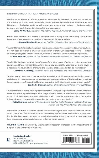 Introduction: Home in African American Literature: Difficult to Define, Challenging to Claim Chapter 1: Movement, Migration, and Homelessness Margaret Walker's Jubilee (1966) Chapter 2: Where I Live is Not Home James Baldwin, Go Tell It on the Mountain (1953); Toni Morrison, The Bluest Eye (1970); Suzan-Lori Parks, Topdog/Underdog (2001) Chapter 3: Lonely Place, Unwelcoming Space A. J. Verdelle's The Good Negress (1995) Chapter 4: A Mother's Desire, A Son's Hell Daniel Black's Perfect Peace (2010) Chapter 5: A Mother's Domination, A Family's Submission Dorothy West's The Living Is Easy (1940) Chapter 6: Wrapped in Imagination and Desire Countee Cullen, "Heritage"; Ann Petry, "Mother Africa"; Lorraine Hansberry, A Raisin in the Sun (1959); Alice Walker, "Everyday Use" (1973); Toni Morrison, Song of Solomon (1977); Phyllis Alesia Perry, Stigmata (1998); Yaa Gyasi, Homegoing (2016); James Weldon Johnson; Sterling A. Brown Conclusion: While We're in This Place . . .