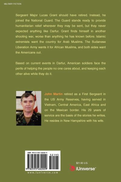 Sergeant Major Lucas Grant should have retired. Instead, he joined the National Guard. The Guard stands ready to provide humanitarian relief wherever they may be sent, but they never expected anything like Darfur. Grant finds himself in another shooting war, worse than anything he has known before. Islamic extremists want the country for Arab Muslims. The Sudanese Liberation Army wants it for African Muslims, and both sides want the Americans out. Based on current events in Darfur, American soldiers face the perils of helping the people no one cares about, and keeping each other alive while they do it.